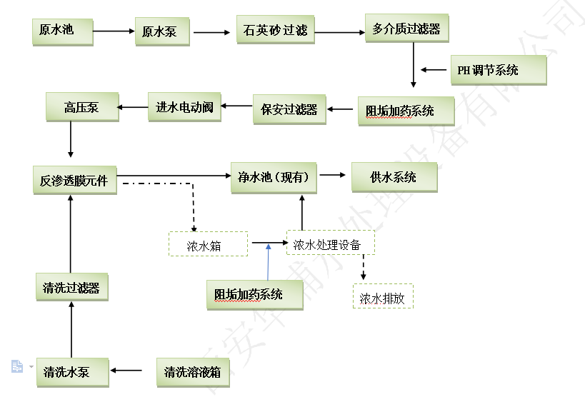 項目工藝:采用“換熱器+多介質過濾器+PH調節系統+阻垢加藥裝置+精密過濾器+反滲透膜法為一體的全自動成套設備”水處理工藝