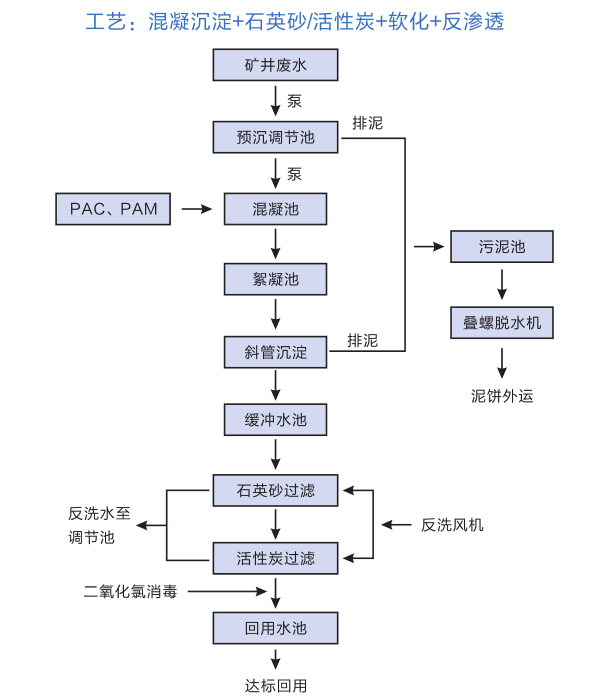 凈化處理技術(shù)主要有沉淀、混凝沉淀、混凝沉淀過(guò)濾(混凝澄清過(guò)濾)等,根據(jù)處理后不同的用途采用不同的工藝組合。