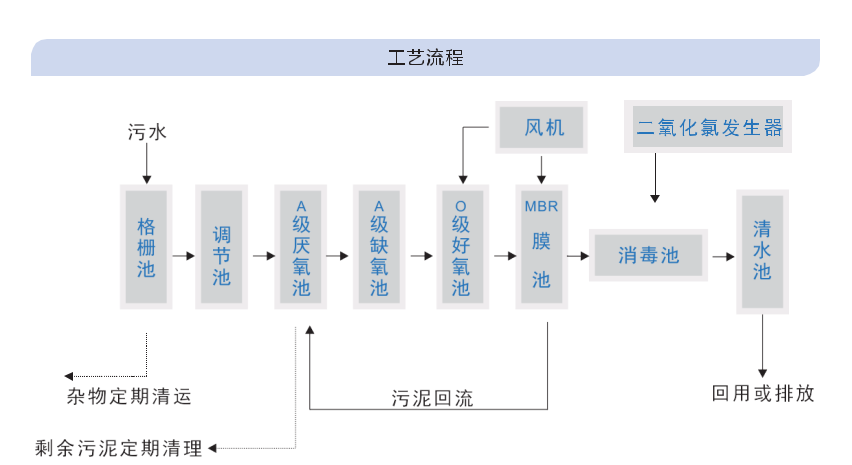 我公司采用成熟的“預(yù)處理-酸化水解-兩級接觸氧化-二氧化氯消毒"綜合處理的工藝。廢水通過沉砂、篩網(wǎng)過濾預(yù)處理后進(jìn)入調(diào)節(jié)池,生化處理采用“酸化水解—好氧”,利用微生物多級新陳代謝來降解和去除廢水中的污染物。生化后的污水采用沉淀池進(jìn)行泥水分離,上清液經(jīng)強(qiáng)氧化劑消毒,達(dá)到殺菌的目的,使之達(dá)到排放標(biāo)準(zhǔn)。